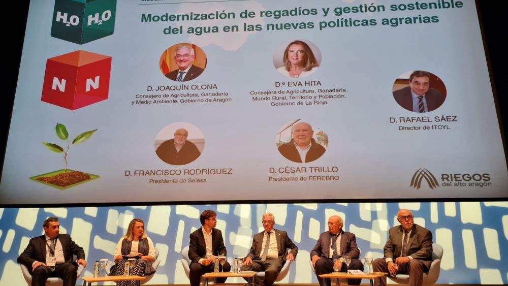 El consejero de Agricultura, Joaquín Olona, ha participado en la mesa debate "Modernización de regadíos y gestión sostenible del agua en las nuevas políticas agrarias" de la 24 Jornada informativa de Riegos del Alto Aragón dedicada a "Modernización de regadíos y fertilización eficiente, herramientas para un regadío sostenible".