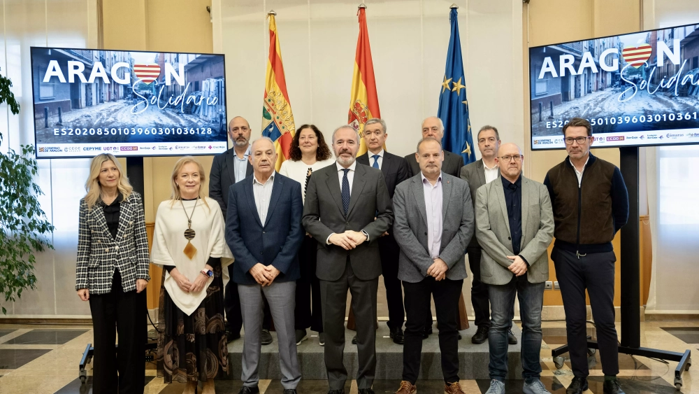El presidente del Gobierno de Aragón, Jorge Azcón, y la vicepresidenta y consejera de Presidencia, Economía y Justicia, Mar Vaquero, han firmado este jueves un convenio de colaboración solidario con la Fundación Bancaria Ibercaja, la Fundación Ibercaja Sostenible, Ibercaja Gestión, Ibercaja Pensión, la Federación Aragonesa de Municipios, Comarcas y Provincias, el Consejo Aragonés de Cámaras de Comercio, CEOE, Cepyme, UGT, CCOO y Cruz Roja.