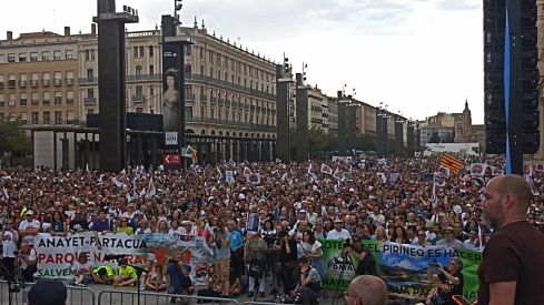 La voz de los miles de participantes la han puesto, ante una plaza del Pilar repleta, Sebastián Álvaro, escritor y creador de Al Filo de lo Imposible, el Eva Amaral y Juan Aguirre, Paco Iturbe y José Luis Martínez, por la PDMA, Eduardo Martínez de Pisón y la himalayista y empresaria del Pirineo Isabel Santolaria, quien ha resaltado el clamor “en defensa de la belleza, una apuesta por preservar aquellas joyas de nuestra naturaleza que contribuyen a garantizar una economía con futuro en nuestros territorios, una responsabilidad ineludible con las futuras generaciones que tienen tanto o más derecho que nosotros a disfrutar de esa belleza”.
