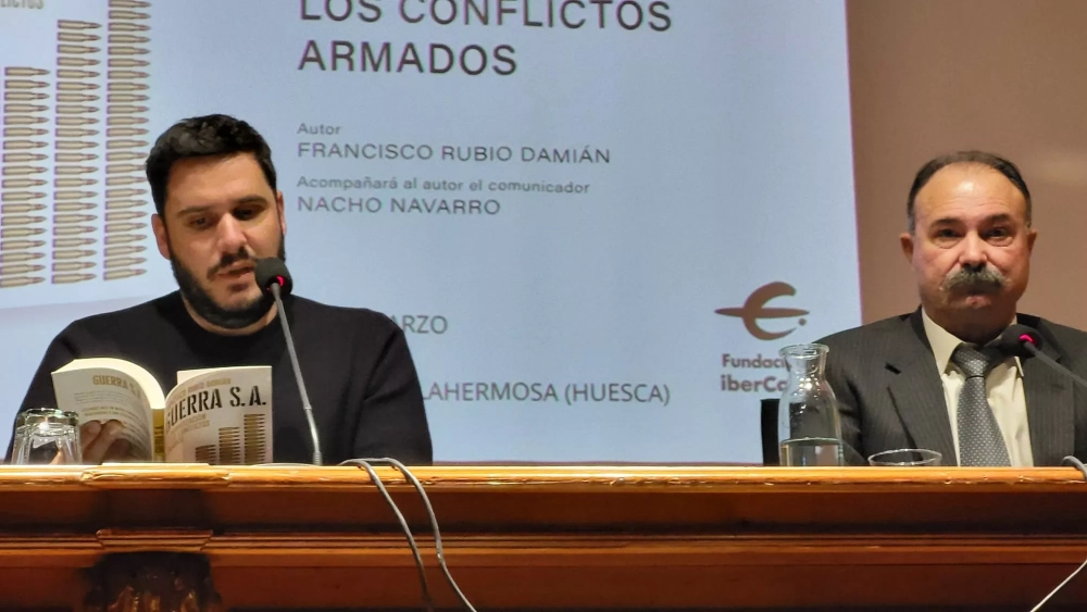 "La prioridad ha de estar en los ejércitos, en las Fuerzas Armadas, en mejorar sus capacidades. Y en la medida en la que no se pueda, de forma transitoria y excepcional, contratar servicios". El coronel Francisco Rubio Damián ha presentado su libro Guerra S.A. La privatización de los conflictos armados, con el comunicador Nacho Navarro en el Centro Fundación Ibercaja en Huesca. Precisamente, Navarro ha comenzado con una frase en la página 3 del libro: "Desgraciado país aquel que alquila los ejércitos en los días de peligros".