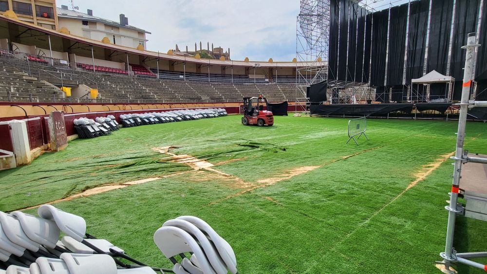 El césped con el que ha sido cubierto el albero de la plaza de toros de Huesca para los conciertos del Prelaurentis presenta varias zonas afectadas por la fuerte lluvia del pasado sábado por la tarde-noche, que obligó a suspender la primera cita de este programa, el esperado concierto de Bob Dylan.