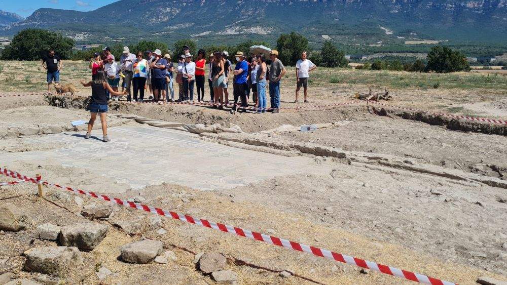 El pasado sábado día 30 se realizó una jornada de puertas abiertas a la zona de excavaciones que, tras una recepción a los visitantes por parte del alcalde Artieda Luis Solana, sirvió para conocer de primera mano los vestigios históricos que, en el entorno de la ermita de San Pedro o formando parte de su propia fábrica, sirvieron para alertar de que un yacimiento romano se hallaba en sus alrededores. Mediante realidad virtual se visualizó y explicó en detalle el mosaico encontrado el pasado año, que se encuentra enterrado a la espera de tener un amplio conocimiento de toda la zona termal, momento en el que todo el conjunto podrá ser musealizado y puesto en valor. También se informó, a los más de 150 asistentes que hubieron de ser organizados en dos grupos y horarios, de las hipótesis con las que se sigue trabajando, en un riguroso y paciente trabajo científico, se dieron explicaciones sobre restos de grandes estructuras que pudieron constituir piezas básicas del abastecimiento y sistema de cloacas de la ciudad y, por parte de los estudiantes que participan en los trabajos de campo, se mostró la metodología que se emplea en este tipo de excavaciones.