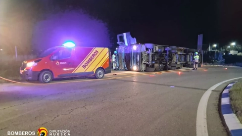 Una persona ha resultado herida tras el vuelco de un camión articulado en la rotonda que une la autovía A-22 con la carretera A-140, en el tramo comprendido entre Binéfar y Binaced. El accidente ha ocurrido esta madrugada, en torno a las 5:30 horas, cuando un camión que transportaba un contenedor refrigerado con carne ha sufrido un vuelco lateral por causas que se investigan.