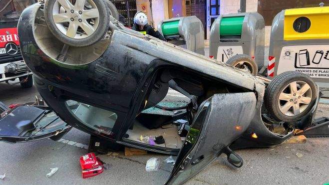 El suceso se ha producido a las 16.30 horas cuando un Nissan Micra Negro ha chocado con uno de los maceteros grandes que frenan la entrada de la calle semipeatonal y después de arrastrarlo más de cien metros, ha golpeado unos contenedores y ha volcado en el tramo calle Zaragoza cerca del cruce con la calle Barbastro de acceso a la plaza San Antonio y ha terminado boca abajo.
