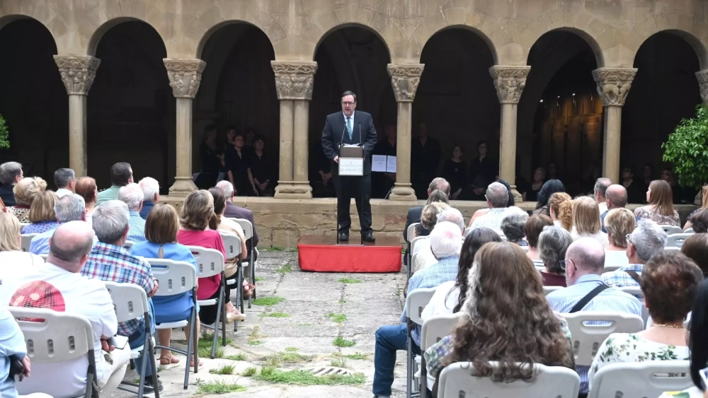 El ponente ha sido Javier García Antón, director de El Diario de Huesca, por problemas de salud de Javier Lambán, presidente que fuera presidente del Gobierno de Aragón. Ha leído una emotiva misiva de Lambán Montañés: "No conozco un caso similar al de la Asociación "Obreros de San Pedro el Viejo de Huesca", heredera de otra institución de funciones similares fundada en el siglo XVI. Desde entonces, el monumento no ha carecido de las esmeradas atenciones de unos verdaderos “guardianes del templo”, de su singular e impresionante historia, de la difusión de su notoriedad, o del celo con el que se ocupan en asegurar su futuro material y espiritual".