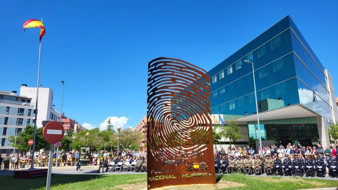 "Pensamos en una huella dactilar" como un elemento importante y representativo. "En la Policía, dejamos nueestras huellas, la Policía busca huellas. Es el elemento que nos diferencia. Cada huella es única. Nos identifica como individuos. Es la señal más fidedigna de nuestra identidad. Somos la huella que dejamos en el devenir de nuestra vida. Huella imborrable, huella etérea". Así lo ha explicado el relator del acto de inauguración de la escultura de la ciudad de Huesca a la Policía Nacional con motivo de su Bicentenario. Son palabras de César Pueyo Tresaco, el reputado herrero (y empresario) de Bolea que ha erigido una imponente pieza en la confluencia de la avenida Pirineos y la calle Fraga.
