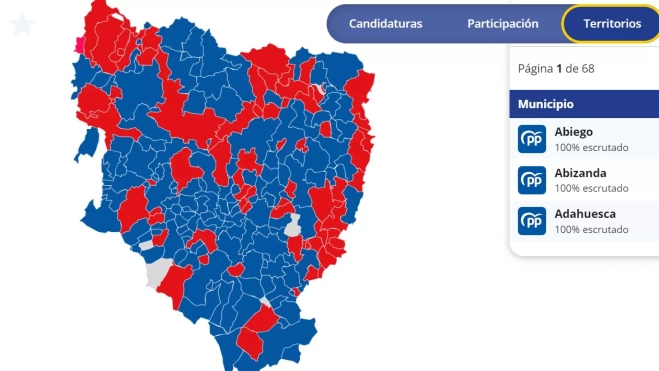 El mapa es la expresión gráfica más evidente del cambio en la provincia de Huesca. De los 202 municipios que jalonan nuestra geografía, restados los cuatro en los que ha habido un empate en voos (pequeños municipios), 135 han votado mayoritariamente al Partido Popular, mientras 63 lo han hecho al Partido Socialista.