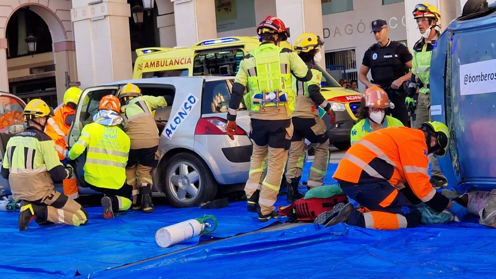 Según el guion, una niña provocaba la colisión que derivaba en el vuelco de un turismo, con dos personas atrapadas y un bebé en riesgo. Los servicios de emergencia han entrado en acción: el 061 ha priorizado la atención médica a los heridos más graves, centrando sus esfuerzos en la víctima que después ha sufrido una parada cardiorrespiratoria. Los sanitarios, además, han realizado una demostración de cómo se aplican maniobras de reanimación en una situación crítica.