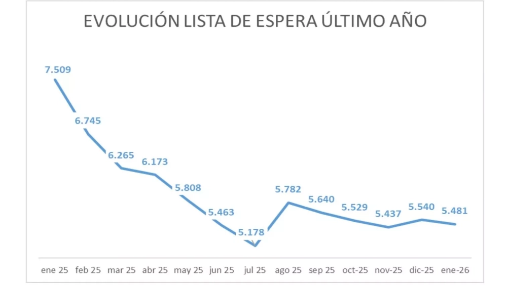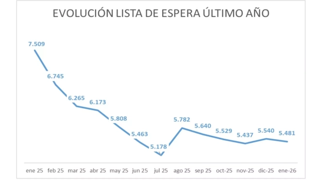 En el conjunto de Aragón, la lista de espera quirúrgica de más de 180 días se ha situado en 5.481 pacientes, lo que supone 2.028 menos que en enero del año pasado, una reducción interanual del 27%, siempre según la información facilitada por el Gobierno autonómico. En términos mensuales, el balance global refleja un descenso de 59 pacientes, un comportamiento que el Ejecutivo destaca como poco habitual en un mes de enero.
