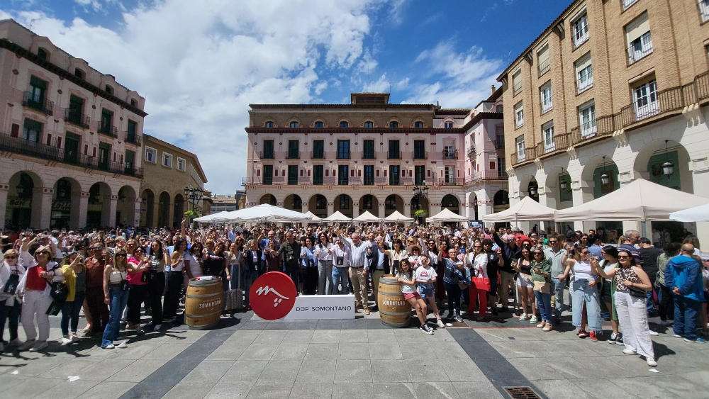 Si en 2023 Huesca acogió el cierre del tour de la Ruta del Vino Somontano, este sábado le toca inaugurar esta actividad que une vino, gastronomía, música y arte, una mezcla que llena la plaza López Allué desde que ha arrancado a las 12 horas.