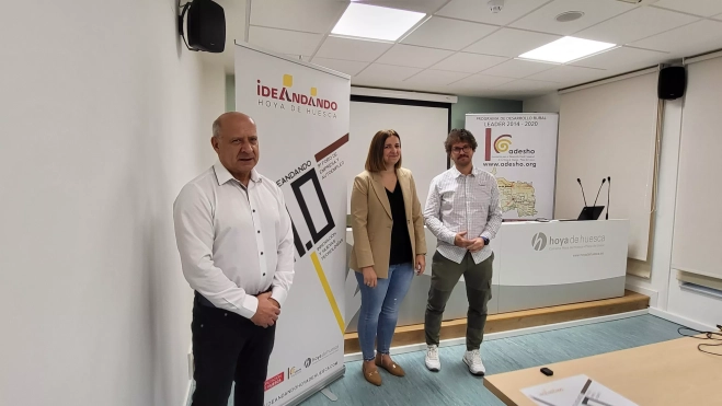 Ideandando 4.0 ha sido presentado este jueves en la sede de la Comarca de La Hoya por su presidente, Mónica Soler, el vicepresidente de Adesho, Pedro Bergua, y el encargado de este foro, Chema Paraled.