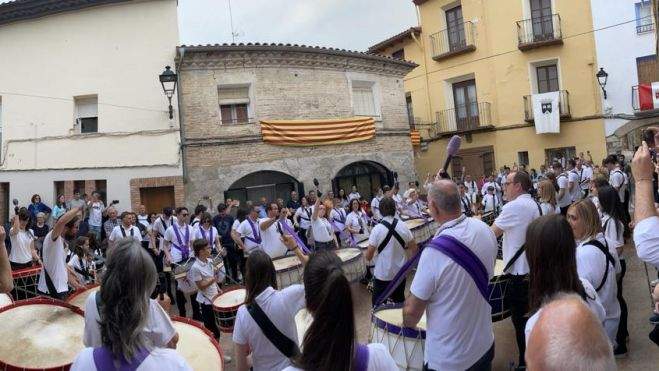 Bombos y tambores sonando en unión, atronando en la plaza mayor de Azanuy, un espectáculo que cada año se espera en la localidad, y que se incluye en los actos de las fiestas patronales en honor a San Pedro de Verona, que se están desarrollando con una alta presencia de público en todas las actividades.