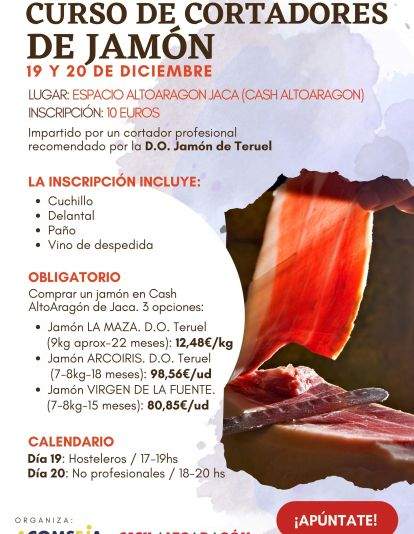 La Asociación de Empresas de la Jacetania (Acomseja), en colaboración con la empresa de distribución de alimentación Cabrero e Hijos, ha organizado para los días 19 y 20 de diciembre un curso de cortadores de jamón, dirigido tanto a profesionales de hostelería como particulares en sesiones separadas.
