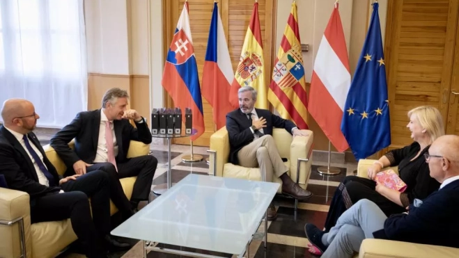El presidente del Gobierno de Aragón, Jorge Azcón, ha celebrado un encuentro en el edificio Pignatelli, sede del Ejecutivo autonómico, con los embajadores de Austria, Enno Drofenick; de República Checa, Libor Sečka; y de Eslovaquía, Juraj Tomaga; así como con la gobernadora de Bohemia Central, Petra Pecková.