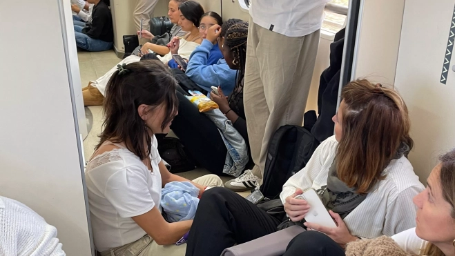 No es la primera ocasión en la que enseñamos fotografías de este calado, con jóvenes arracimados y sentados en los pasillos para realizar el trayecto hasta Huesca, con previsión de llegada a las 15:28.