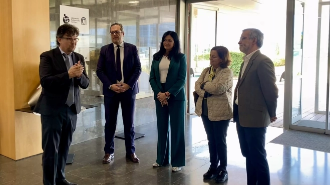 El Laboratorio Subterráneo de Canfranc (LSC) trabaja en la instalación de su centro logístico y de control de calidad en Walqa. Su director, Carlos Peña, ha visitado este jueves el parque tecnológico oscense, junto con personal del Laboratorio, donde han sido recibidos por la alcaldesa de Huesca, Lorena Orduna, y el director del parque, Carlos Ortas.