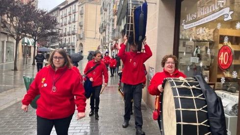 A las 11 horas comenzaba este encuentro, en el que se han realizado diversas actuaciones en los puntos previstos en distintas zonas de la ciudad, como la plaza López Allué, donde han emocionado con sus toques las cofradías de Huesca, Robres y Binéfar.