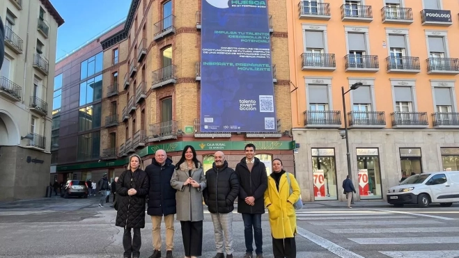 Huesca ha dado este viernes un nuevo paso en la preparación del Tour del Talento 2026 con la instalación de la lona que ya cuelga de la fachada de Caja Rural, en la plaza de Navarra, y que anuncia la llegada a la ciudad de una de las cinco paradas nacionales de esta iniciativa impulsada por la Fundación Princesa de Girona. El acto ha contado con la participación de la alcaldesa, Lorena Orduna, concejales del equipo de gobierno y el jefe de centros de la Fundación Ibercaja, Roberto Cerdán, entidad coorganizadora junto al Ayuntamiento oscense.