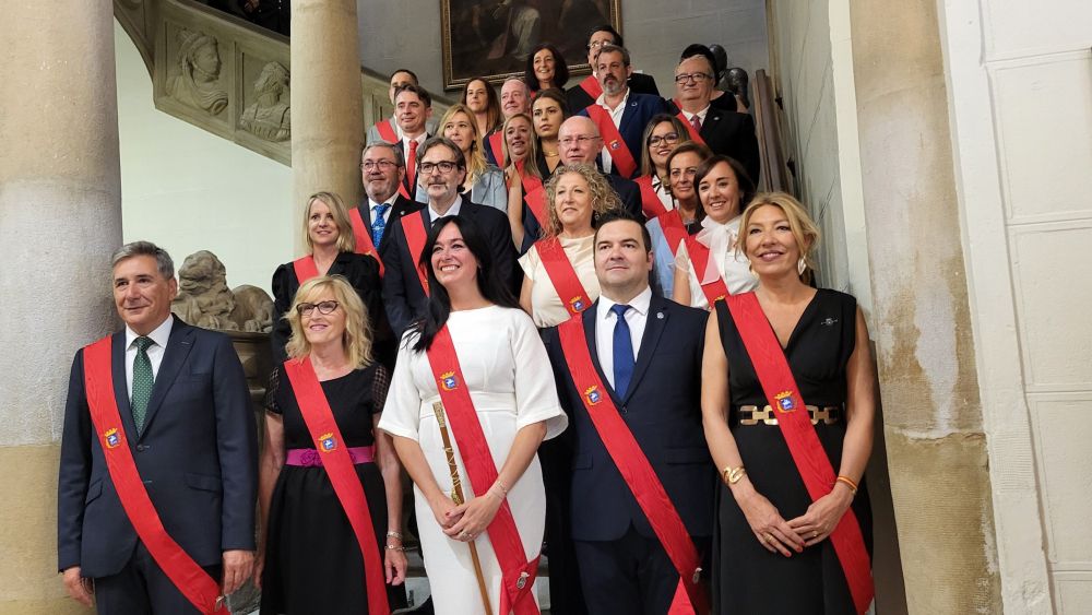 La sesión constitutiva ha comenzado a las 10 horas con la constitución de la mesa de edad, formada por José Miguel Veintemilla y Belén Almudévar, ambos del PP, los primeros ediles en recibir la banda. Ellos han sido los encargados de imponerla al resto de los 23 concejales electos que conforman el nuevo Consistorio, con mayoría de mujeres, con un total de 14 y 11 hombres.