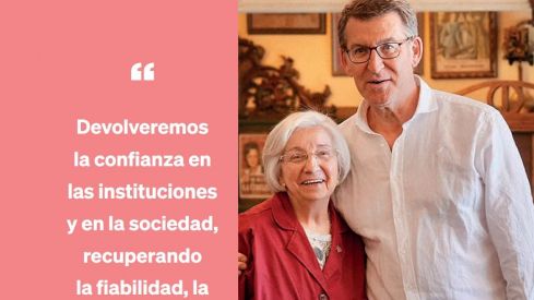A la fotografía en la que aparece María Jesús Sanvicente y Núñez Feijóo, le acompaña un entrecomillado que juega con el nombre de la tienda de la oscense: "Devolveremos la confianza en las instituciones y en la sociedad, recuperando la fiabilidad, la seguridad jurídica y el respeto a los empresarios y trabajadores y al diálogo social".