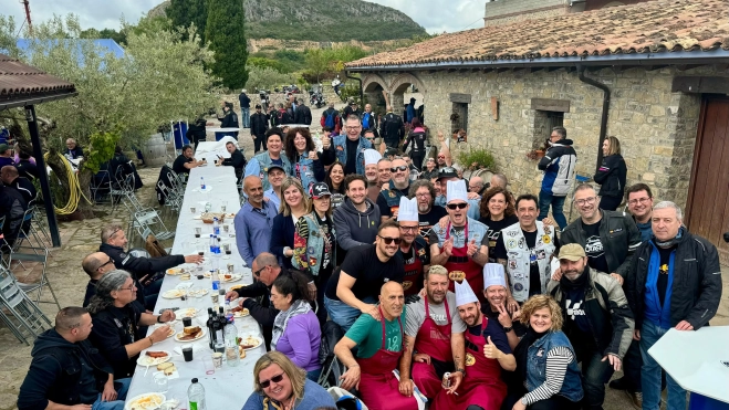 El presidente de la Diputación de Huesca, Isaac Claver, y la alcaldesa de Estadilla, Pilar Lleyda, han acompañado a más de 300 personas en el "maño almuerzo" organizado por el motoclub “Tártaros descilindrados” en la Bodega Aldahara