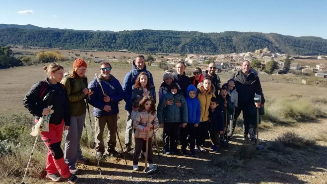 A continuación, el grupo se dirigió a la peña de los Moros, el monte situado frente a Biscarrués y que apenas cuenta con vegetación. La actividad duró tres horas en las que, paseando por la zona, se fueron haciendo sencillos agujeros en el suelo para plantar las bellotas horizontalmente. También se colocaron algunas carrascas y pinos ya en plantero. De esta forma, se consigue mejorar un monte que es complicado que se regenere por sí solo.