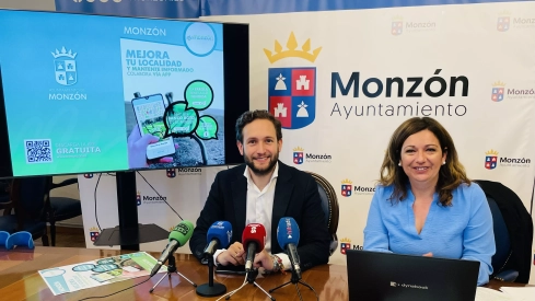 El alcalde de Monzón, Isaac Claver, y la concejal de Transformación Digital, Sonia Bastinos, han presentado este viernes en el Salón Azul de la Casa Consistorial esta aplicación, que será un nuevo canal directo de comunicación con el Ayuntamiento por el cual el ciudadano puede informar de desperfectos o incidencias que detecten en la ciudad, entre otras utilidades.