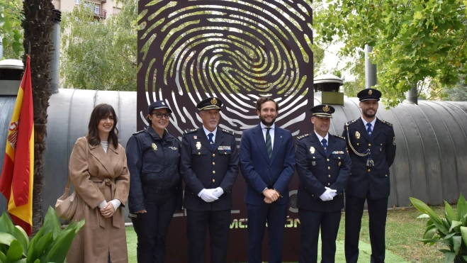 La escultura homenaje, obra de César Pueyo Tresaco, representa una huella dactilar, como símbolo de técnicas de documentación y de investigación policiales, así como características que representan la presencia de la Policía Nacional y su unión con los ciudadanos.