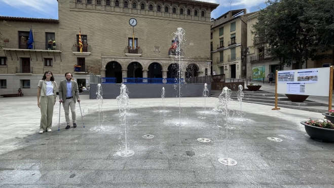 El alcalde de Monzón, Isaac Claver, y la concejala de Urbanismo, Nuria Moreno, han explicado este viernes las obras realizadas y han puesto en marcha la fuente que se integra en el pavimento donde también se ha diseñado la palabra Monzón. El proyecto ejecutado tiene como objetivo fundamental mejorar la calidad del espacio urbano, su funcionalidad y su imagen para lo que se han renovado los pavimentos deteriorados para mejorar el tránsito rodado y peatonal, con materiales unificados.