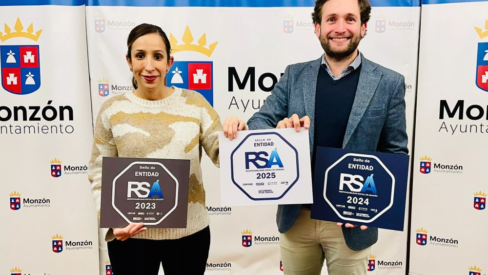 El Ayuntamiento de Monzón ha renovado, por tercer año consecutivo, el Sello de Responsabilidad Social de Aragón como reconocimiento a la implantación y aplicación de prácticas socialmente responsables en Monzón, Selgua y Conchel. El alcalde, Isaac Claver, y la concejal de Servicios Sociales, Mirella Martínez, han recogido el sello, que tan solo lo tienen cuatro ayuntamientos de los 202 municipios de la provincia de Huesca.