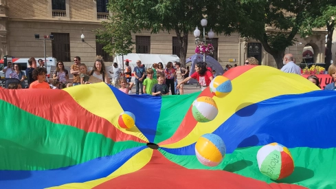 Durante la concentración en la plaza de Navarra se ha extendido un paracaídas que han ido agitando docentes, familias y alumnos para mantener sobre la lona unas pelotas como símbolo de que todas las piezas que componen el sistema educativo son fundamentales y no deben perderse.