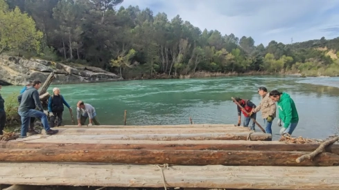 Estas ramas de sarga se transforman en cuerdas resistentes y flexibles con las que se atan los troncos que formarán las nabatas. El objetivo es asegurar que los pesados trampos, de más de 2.000 kilos cada uno, puedan surcar el cauce del Gállego como se hacía antaño, cuando los madereros descendían por los ríos del Pirineo para transportar la madera a zonas más accesibles, una tradición declarada Patrominio Cultural Inmaterial por la Unesco en 2022.