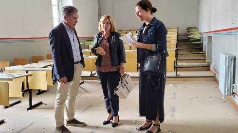 Olivan ha visitado este jueves, junto con la vicerrectora del Campus de Huesca, Marta Liesa, y la arquitecta de la DPH Laura Puyal, la zona del edificio de la antigua residencia de niños en la que se va a actuar, casi 5.000 metros cuadrados que corresponden al 35 por ciento del edificio, que quedó sin rehabilitar debido a la crisis de 2008, y que no se utiliza desde hace más de diez años.