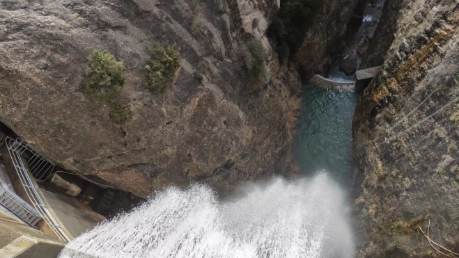 El embalse de Guara, conocido también como pantano de Calcón, está desembalsando al haber sobrepasado la máxima capacidad de 3,65 hectómetros cúbicos, por lo que la presa de 63 metros de altura está desarrollando una actividad poco frecuente.