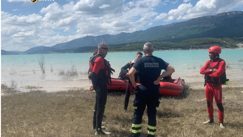Bomberos de la Diputación Provincial de Huesca del parque de Sabiñánigo junto con bomberos de Diputación Provincial de Zaragoza y de Navarra han acudido este mediodía al embalse de Yesa, en la zona de Tiermas, por un aviso del 112 solicitando el rescate de un hombre que estaba haciendo paddle surf.