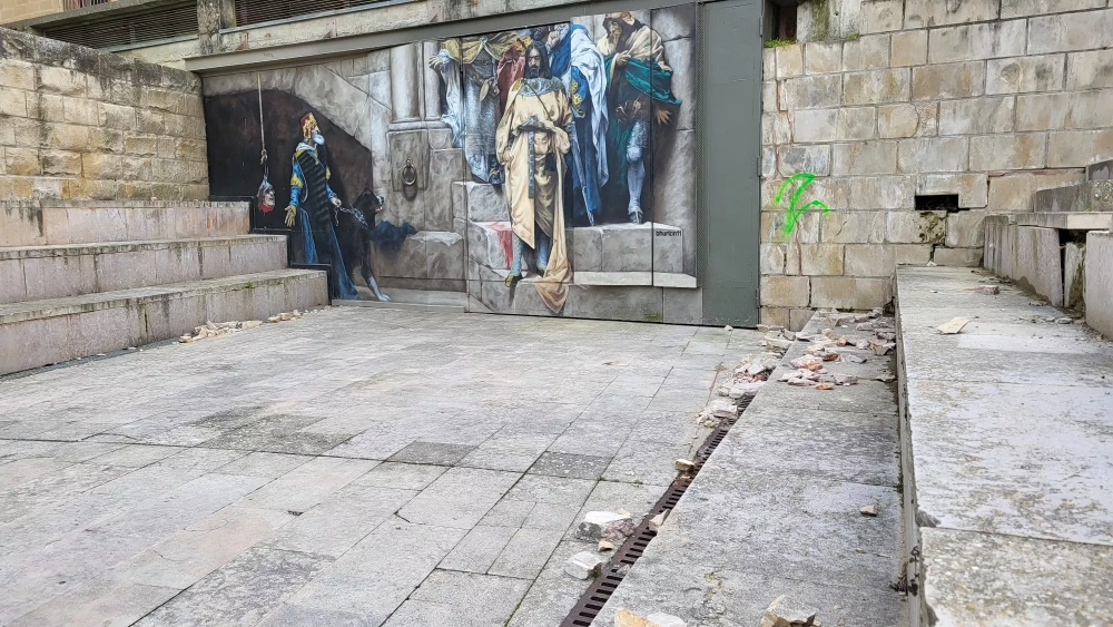 La única buena nueva es que el muro dibujado con el Cuadro de la Campana está absolutamente impoluto, Con Ramiro el Monje, los nobles levantiscos continúan intactos e íntegros, testigos mudos e incomunicados de la tropelía de algunos desalmados.