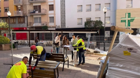 La actuación se acomete tras la reubicación de los veladores de un establecimiento fuera de la plaza, lo que permite ejecutar el proyecto. La concejal de Urbanismo, Nuria Moreno, junto a la técnico Rebeca Barbanoj, el arquitecto, Miguel Domper, y la empresa encargada de los trabajos, Hormigones Grañén, han supervisado este viernes el arranque las obras que se prolongarán durante dos semanas.