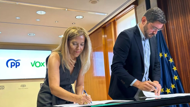Los portavoces en las Cortes de Aragón del Partido Popular, Ana Alós, y de VOX, Alejandro Nolasco, han firmado este viernes un acuerdo para conformar el Gobierno de la comunidad autónoma, que presidirá el popular Jorge Azcón y en el que el partido verde dirigirá dos de las consejerías, la de Desarrollo Territorial, Despoblación y Justicia, que tiene rango de Vicepresidencia primera, y la de Agricultura y Ganadería. Una de las consejerías del PP tendrá el rango de Vicepresidencia segunda del futuro Gobierno autonómico.