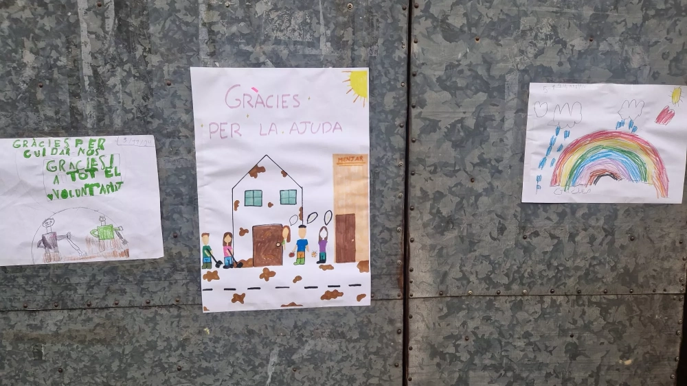 Los niños han pegado tres dibujos en los que se afirma "Gracies per cuidarnos, gracies a tot el voluntariat" y "gracies per la ajuda", con personas en faena, casas con personas y el sol en lo más alto, y un atrcoiris que brota junto a nubes que descargan gotas de lluvia.