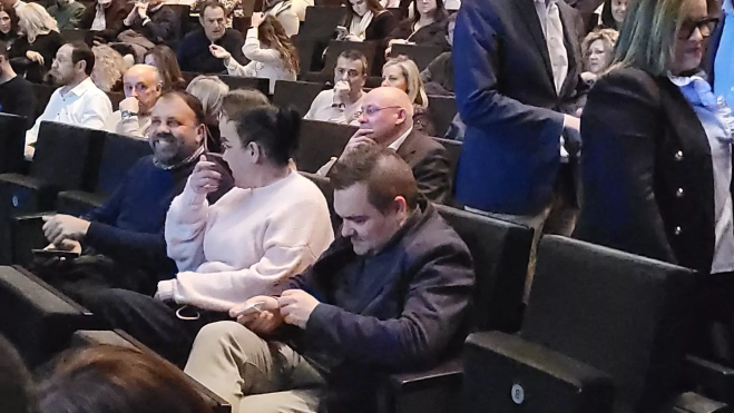 Mientras el Auditorio Carlos Saura del Palacio se iba llenando, llamaba la atención sobremanera la presencia del alcalde socialista, acompañado por su cónyuge y junto al concejal del Ayuntamiento de Huesca Antonio Laborda. Estaban sentados en la parte central de la segunda fila.