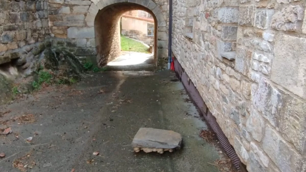 Uno de los principales escudos de la fachada de Casa Señor de Laguarta, declarado Bien de Interés Cultural e inscrito en el Sipca (Sistema de Información del Patrimonio Cultural Aragonés), se ha precipitado en mitad de la vía pública, según denuncia la Sociedad de Propietarios, que añade como agravante que esta pieza que pesa entre 00 y 300 kilos ha caído en un camino público señalizado (GR 268) que comparten niños, epregrinos del Camino de San Úrbez y vecinos del pueblo que se están acostumbrando a retirar restos caídos del edificio.
