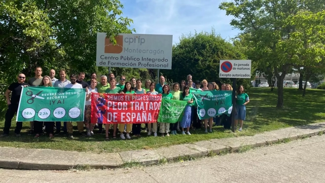 El profesorado del Centro Público Integrado de Formación Profesional (CPIFP) Montearagón se congregó este jueves, durante los descansos de la mañana y la tarde, para expresar su profunda disconformidad con los recortes anunciados en los cupos de docentes para el próximo curso académico. La protesta tuvo lugar en las instalaciones del centro educativo.
