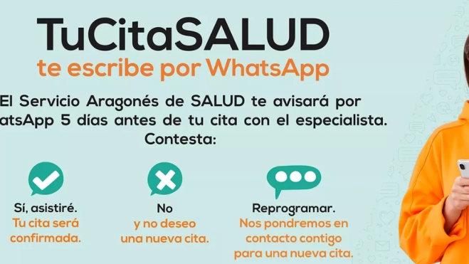 Cinco días antes de la cita con el especialista, el paciente recibe un mensaje de WhatsApp en su teléfono móvil desde un número verificado del Servicio Aragonés de Salud. Puede responder con “SI” para confirmar la cita, “NO” para cancelarla o “REPROGRAMAR” para solicitar una nueva fecha.