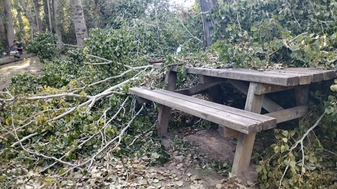 El panorama resulta bastante desolador, con ramas tronchadas o arrancadas sobre el mobiliario de madera y colgando en altura, y troncos que cortan caminos o han quedado cruzados en el río. También se aprecia abundante hojarasca por el suelo, en diversos puntos de este paraje y su acceso.