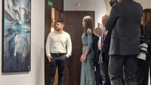 La Reina Doña Letizia ha mantenido este martes un encuentro con jóvenes artistas en el Palacio Villahermosa, sede de la Fundación Ibercaja en Huesca, que dirige Roberto Cerdán, dentro del programa del Tour del Talento. La reunión con los creadores seleccionados del Premio Fundación Ibercaja de Pintura Joven ha constituido uno de los ejes de una visita organizada en tres fases: el patio exterior, la biblioteca y la sala de exposiciones.