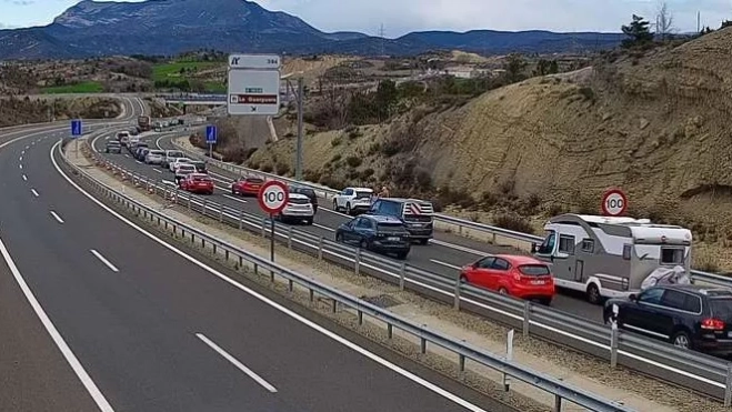 El tráfico intenso de visitantes que se dirigen hacia el Pirineo está provocando congestión en la A-23 a la altura de Lanave, entre los kilómetros 393,5 y 394,2, así como en la N-330, desde el punto kilométrico 614, en Lanave, hasta el 618,6, en Hostal de Ipiés. Este tramo concentra un habitual cuello de botella al pasar de la autovía A-23 a la N-330, una situación habitual que se agrava especialmente en los días de mayor afluencia hacia el Pirineo como este jueves festivo de inicio de las vacaciones de Semana Santa.