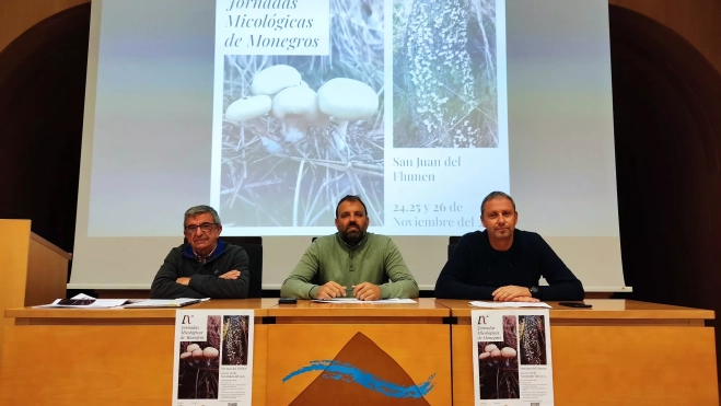 Las IX Jornadas Micológicas de Monegros se han presentado en rueda de prensa este martes en el salón de actos comarcal en Sariñena, con la intervención del presidente de la Comarca de Los Monegros, Pedro Loscertales, el alcalde de Sariñena, Juan Escalzo, y el presidente de la Asociación Micológica de Los Monegros, Jesús Fantova.