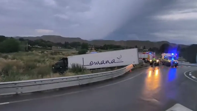 Un camionero ha sufrido un accidente en torno a las 08:00 de este lunes, al salirse de la vía con su vehículo de tercera categoría en el punto kilométrico 205 de la N-240, en la rotonda de Montearagón, término municipal de Huesca.