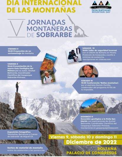 Sobrarbe acoge la celebración del Día Internacional de las Montañas, instaurado por la ONU el 11 de diciembre, y organiza unas jornadas montañeras con la colaboración del Geoparque Sobrarbe-Pirineos y los clubes de montaña Navaín, CAS, Peña Cancías, Mondarruego-Ordesa y también el Ayuntamiento de Boltaña, en cuyo palacio de congresos se desarrollarán las charlas y proyecciones, que comienzan el viernes 9 de diciembre con la proyección de un cortometraje de montaña y la presentación de la Nueva guía geológica del Pirineo de Ánchel Belmonte, coordinador científico del Geoparque. El sábado 10 de diciembre está previsto un taller de seguridad invernal del GREIM de Boltaña y por la tarde, el alpinista Ramón Portilla, colaborador del programa televisivo “Al filo de lo imposible", ofrecerá una charla bajo el título “Bellas montañas”.