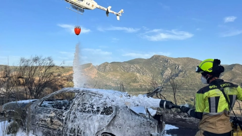 El suceso se ha producido la tarde de este viernes en la carretera A-138, en el término de El Grado. A la llegada de los bomberos el incendio se estaba propagando a una masa forestal entre la carretera y el río Cinca, que también se ha tenido que controlar junto al fuego en el vehículo.